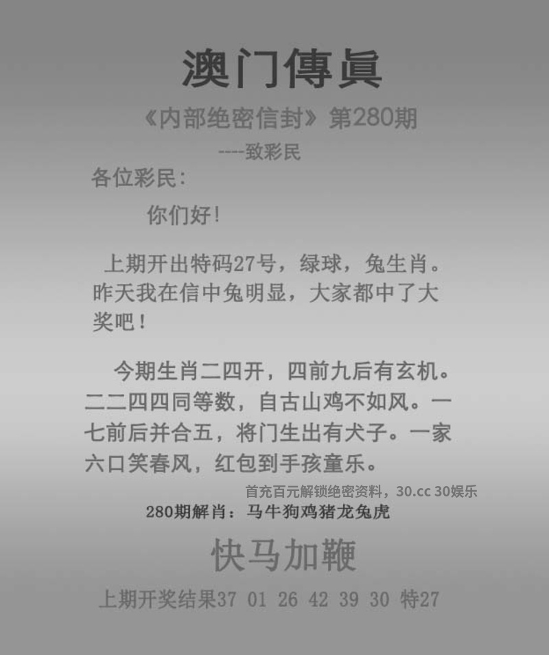 277期【马会传真】开虎16准 今期生肖三十开,四下五上是灵码 三千佳丽住后宫,火中有肖是五七 风流才子俏佳人,玄机道破点三二 一语双关话特码,二七美女大家求 解:今期三千佳丽住后宫,解吉美生肖兔龙蛇马羊鸡,火中有肖是五七,解火肖蛇马 综合:猴虎兔蛇狗猪鸡马羊 |